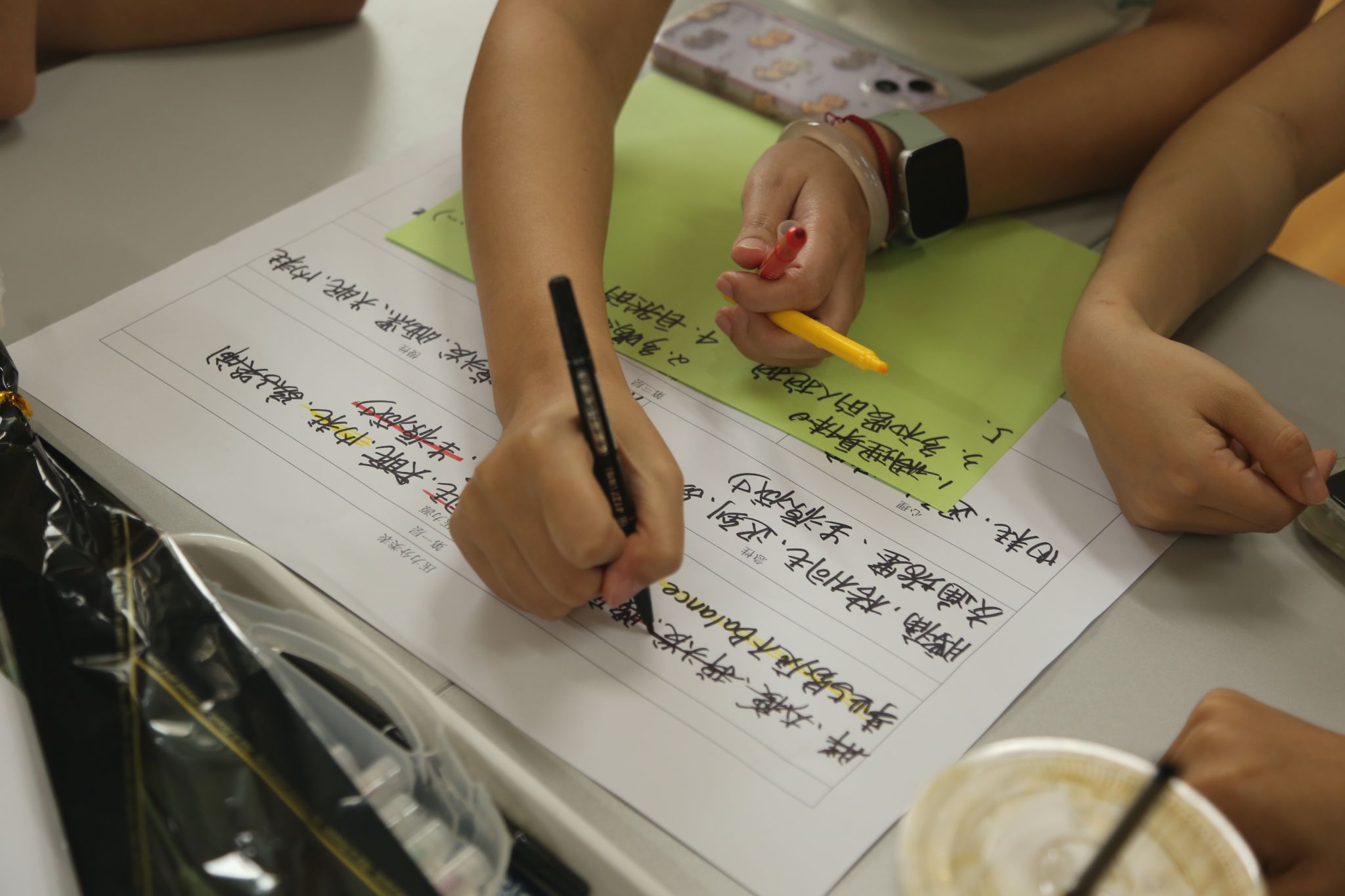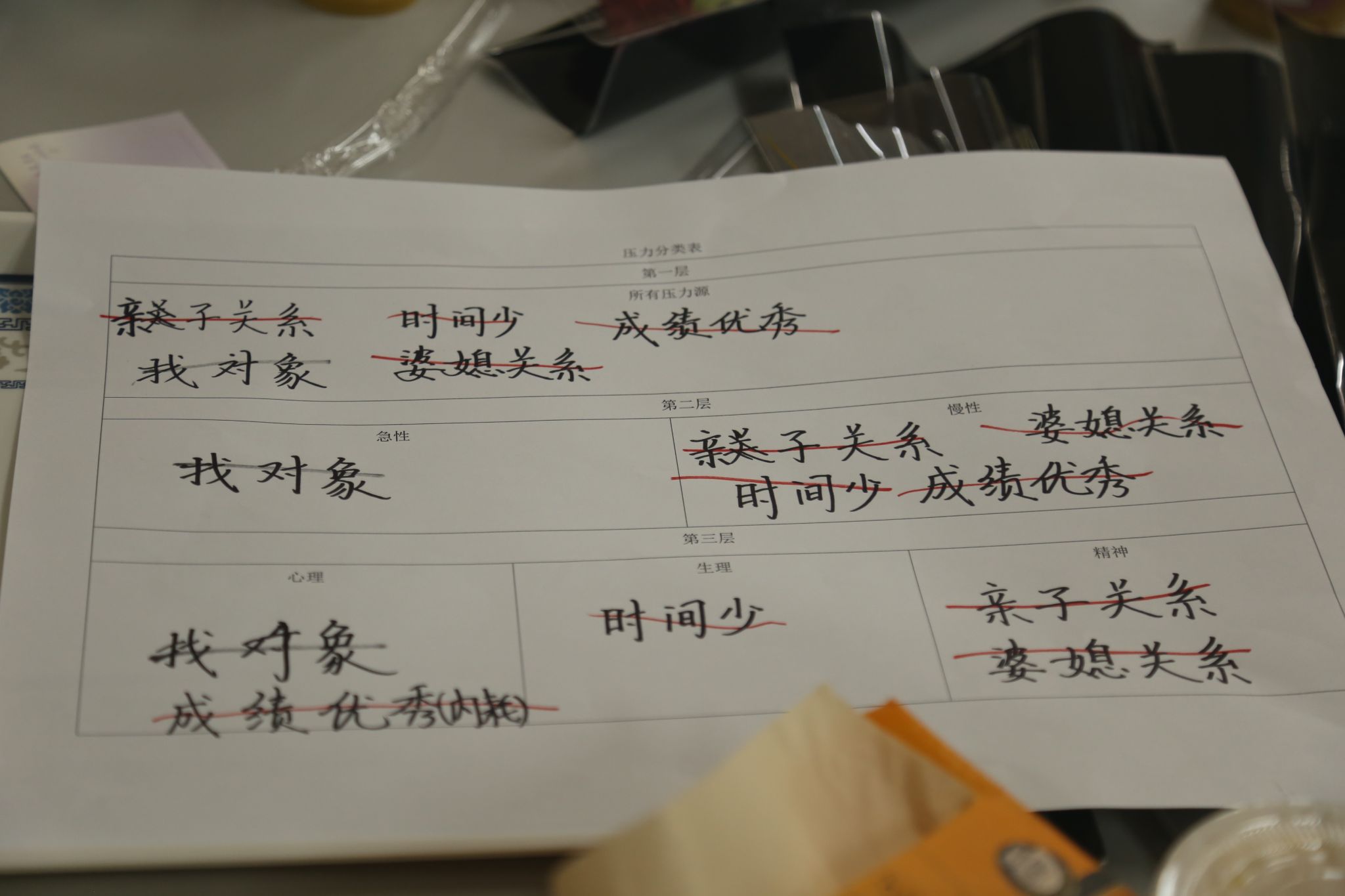 分组结束后,各小组老师围绕 “压力” 展开联想,写下自己当下的压力以及面对压力时的各类感受与想法,再通过 “压力分类表” 梳理压力源,清晰区分不同性质、不同持续时间的压力类型。“压力锦囊” 环节中,各组充分发散思维、热烈讨论,想出多种实用解压方法,内容从调节情绪到放松身心,涵盖不同维度,最终汇总出 10 余种对策,为老师们送上了 “减压工具箱”。之后,老师们用不同颜色的笔标记可解决的压力,将表格投入 “压力回收站” 彻底 “清空”;接着在彩色卡纸上写下生活与工作中的幸福片段,互相拥抱鼓励。
